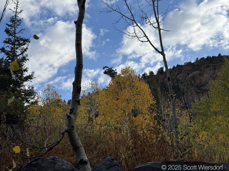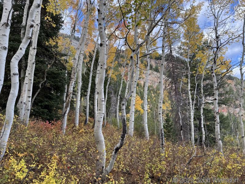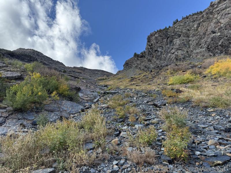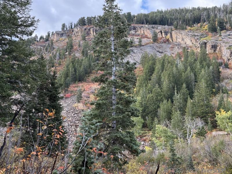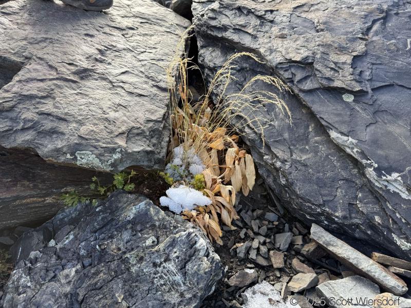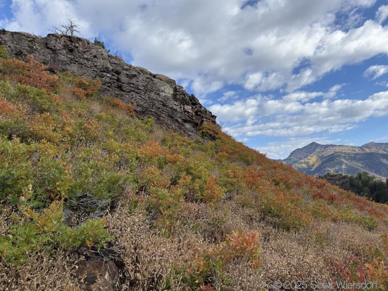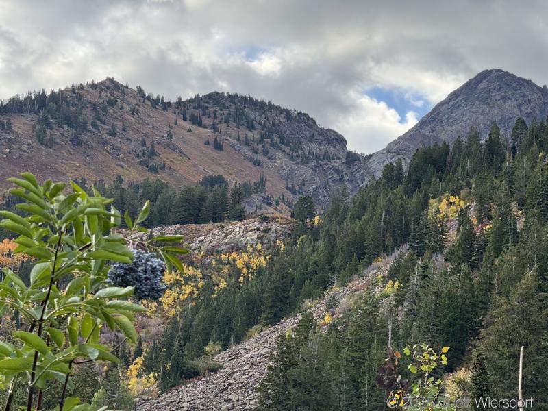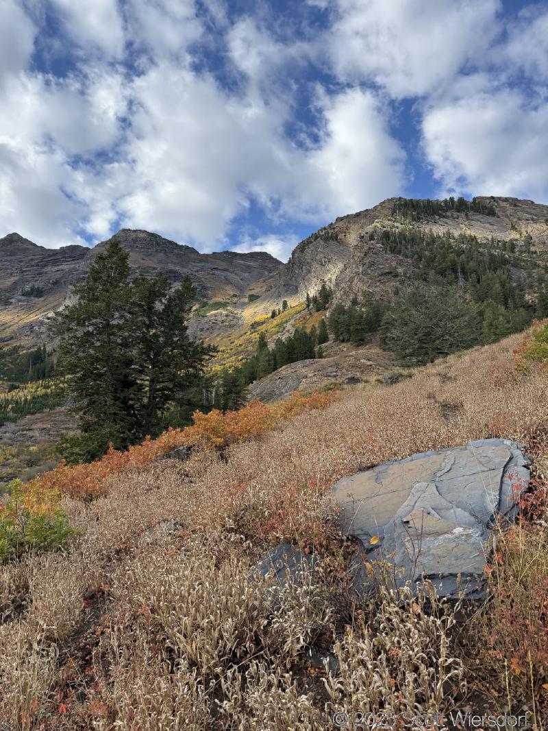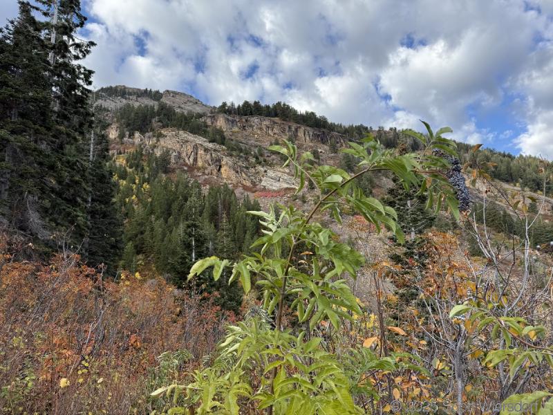 The trailhead is at the base of the “S” curve in Big Cottonwood Canyon. There are two trailheads that the parking lot services: Mill B South and Broads Fork. Broads Fork is at the west end. We had cool weather, probably in the mid-to-high 40’s (°F), with an occasional light breeze. Cloud cover kept us cool most of the way up. If we stopped for more than a few minutes, the breeze chilled us off pretty good. No complaints about the weather—it was a perfect day for us. We noticed a few patches of snow trapped in some of the high elevation (and sheltered) plants from yesterday’s storm that passed through.
