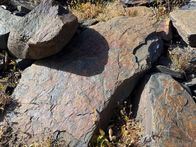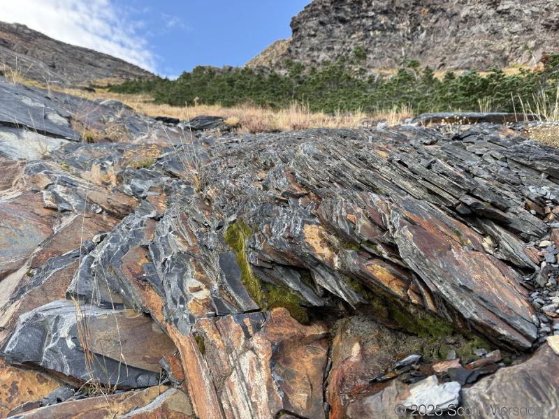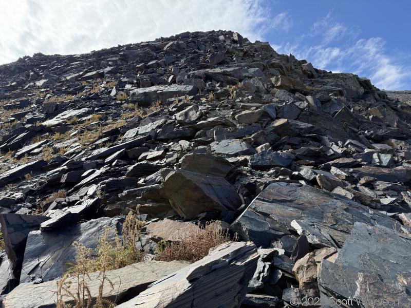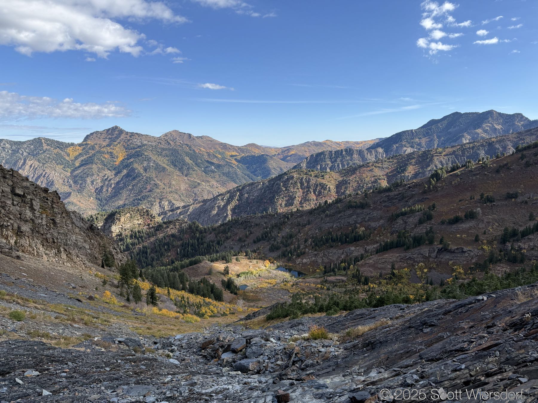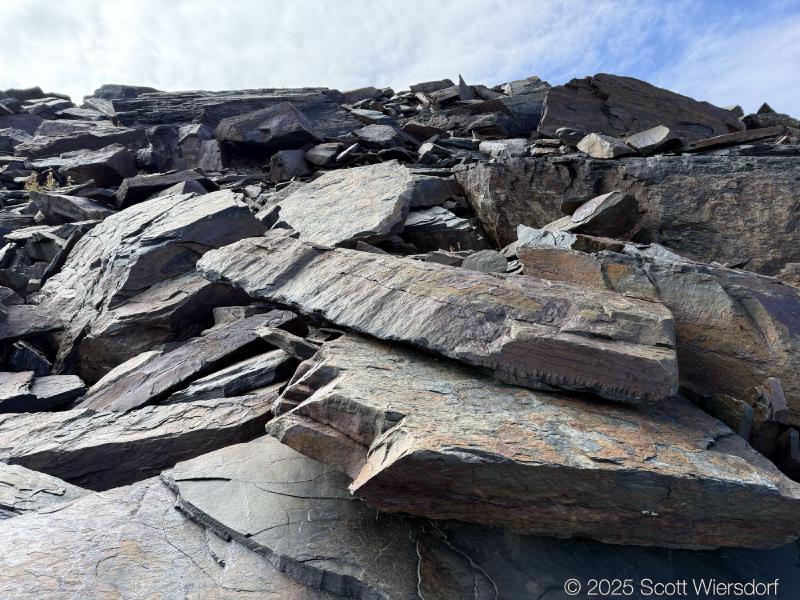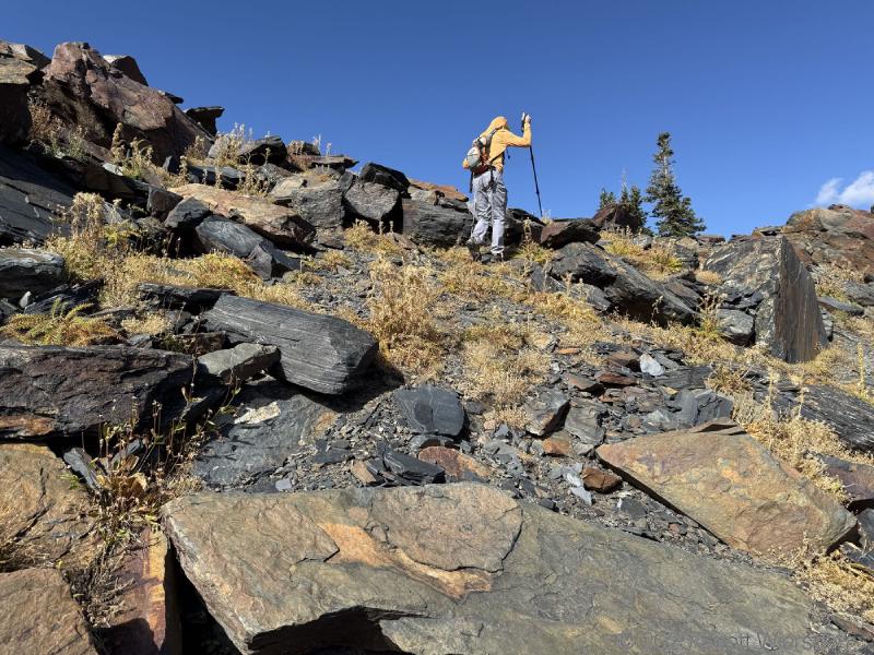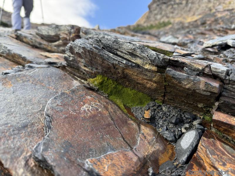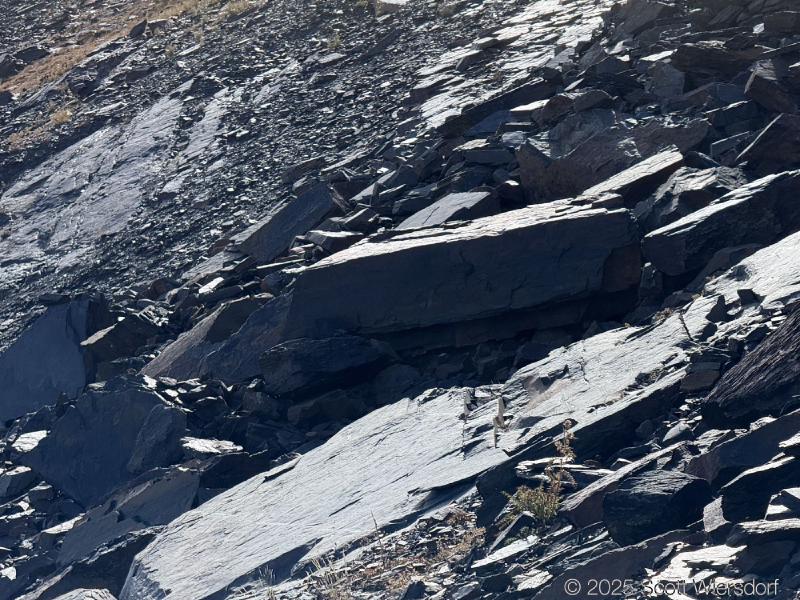 The trailhead is at the base of the “S” curve in Big Cottonwood Canyon. There are two trailheads that the parking lot services: Mill B South and Broads Fork. Broads Fork is at the west end. We had cool weather, probably in the mid-to-high 40’s (°F), with an occasional light breeze. Cloud cover kept us cool most of the way up. If we stopped for more than a few minutes, the breeze chilled us off pretty good. No complaints about the weather—it was a perfect day for us. We noticed a few patches of snow trapped in some of the high elevation (and sheltered) plants from yesterday’s storm that passed through.