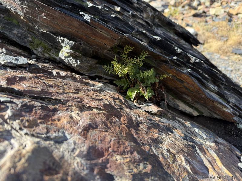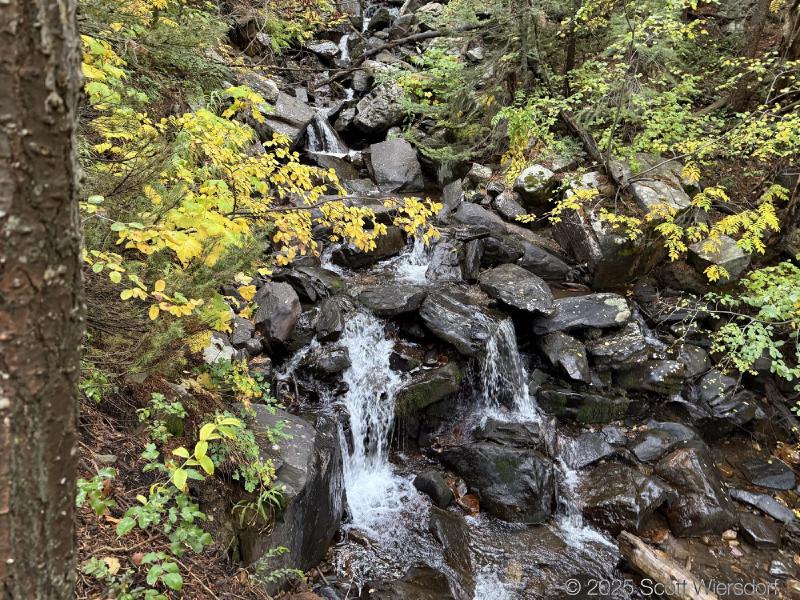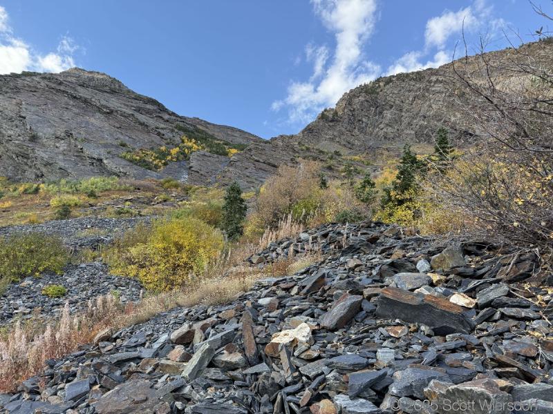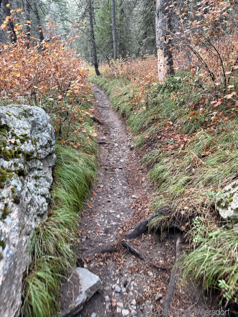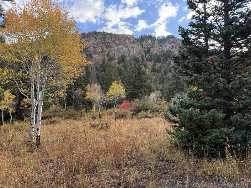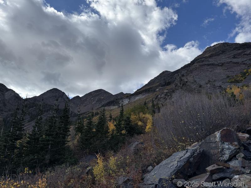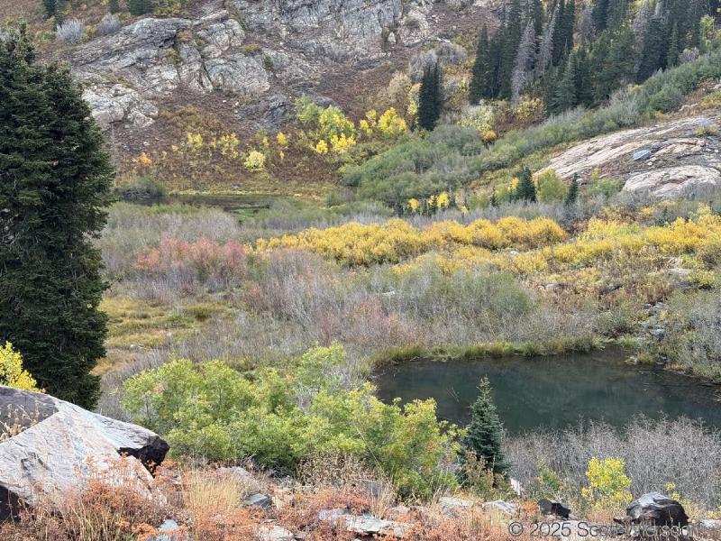 The trailhead is at the base of the “S” curve in Big Cottonwood Canyon. There are two trailheads that the parking lot services: Mill B South and Broads Fork. Broads Fork is at the west end. We had cool weather, probably in the mid-to-high 40’s (°F), with an occasional light breeze. Cloud cover kept us cool most of the way up. If we stopped for more than a few minutes, the breeze chilled us off pretty good. No complaints about the weather—it was a perfect day for us. We noticed a few patches of snow trapped in some of the high elevation (and sheltered) plants from yesterday’s storm that passed through.