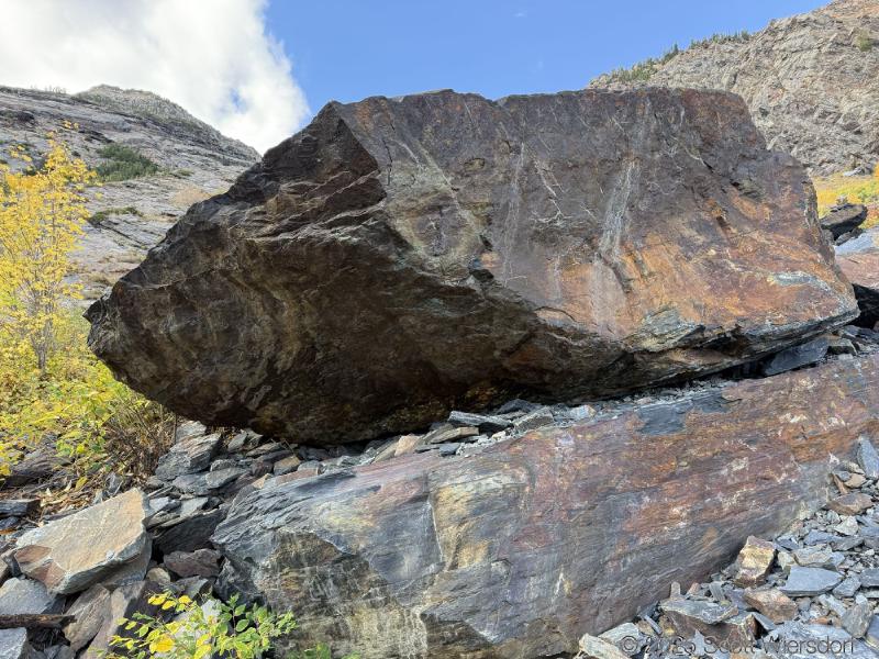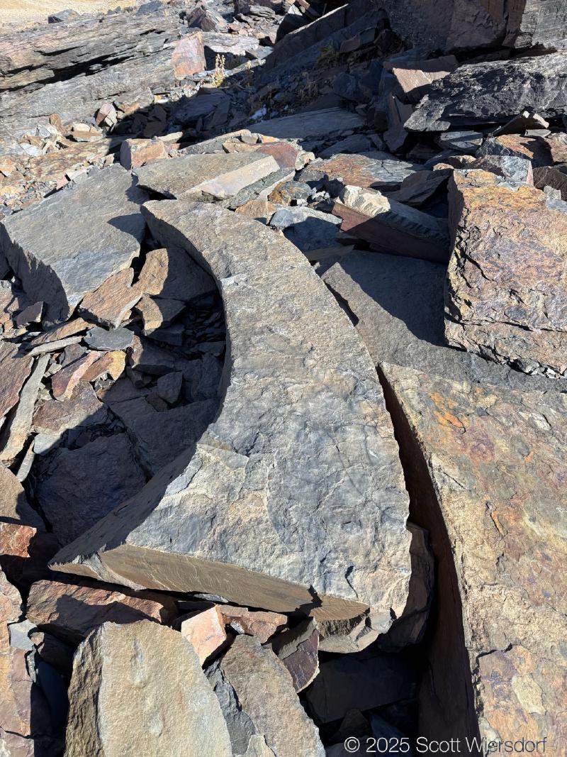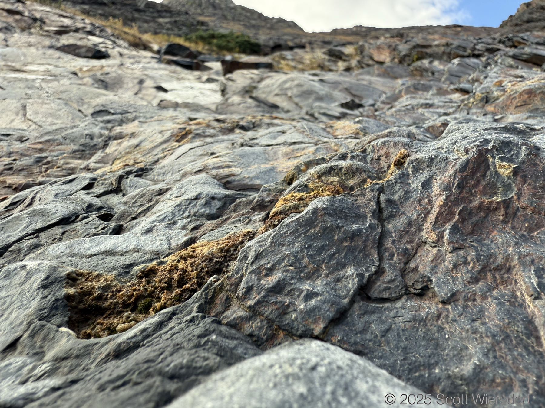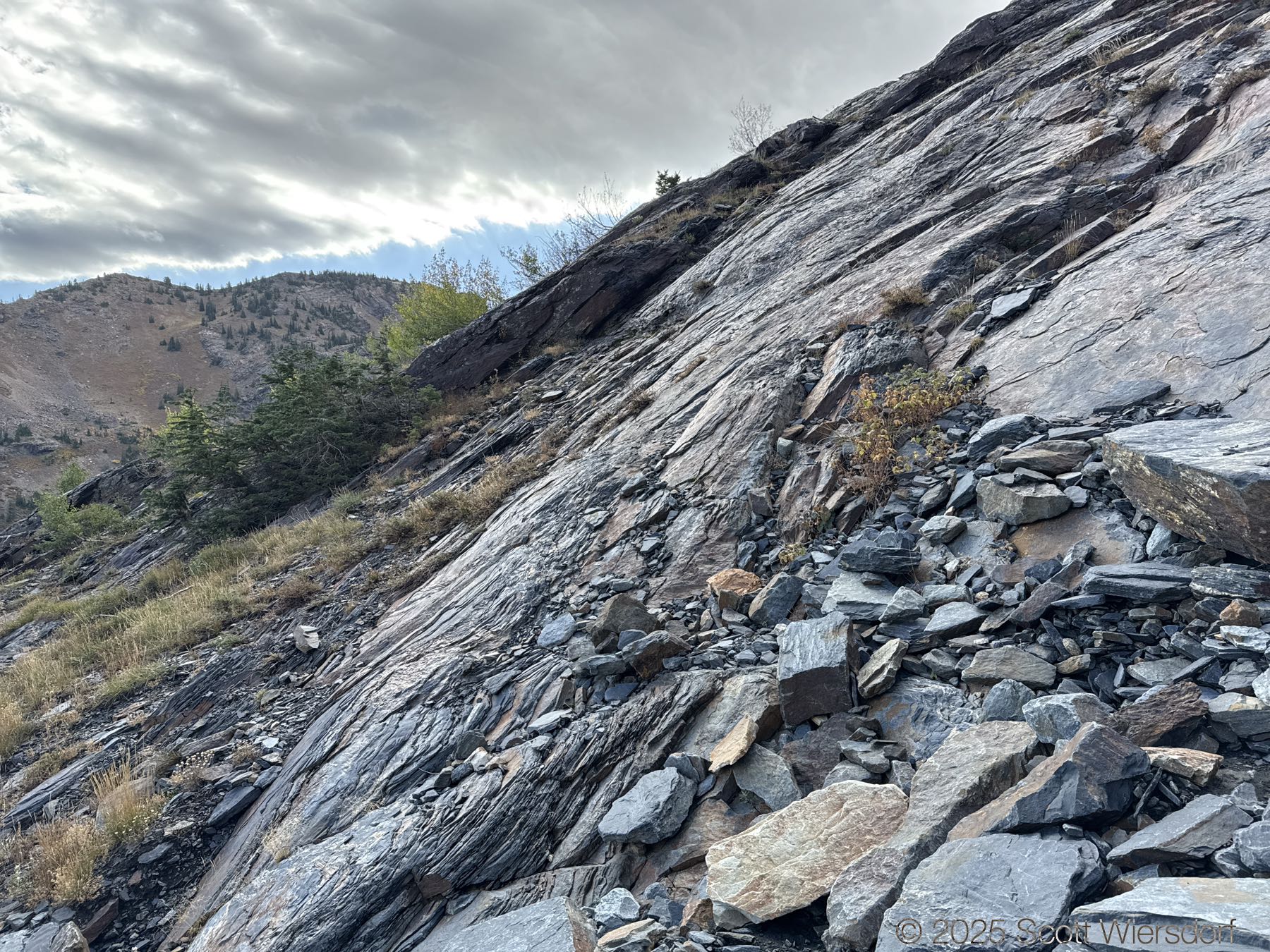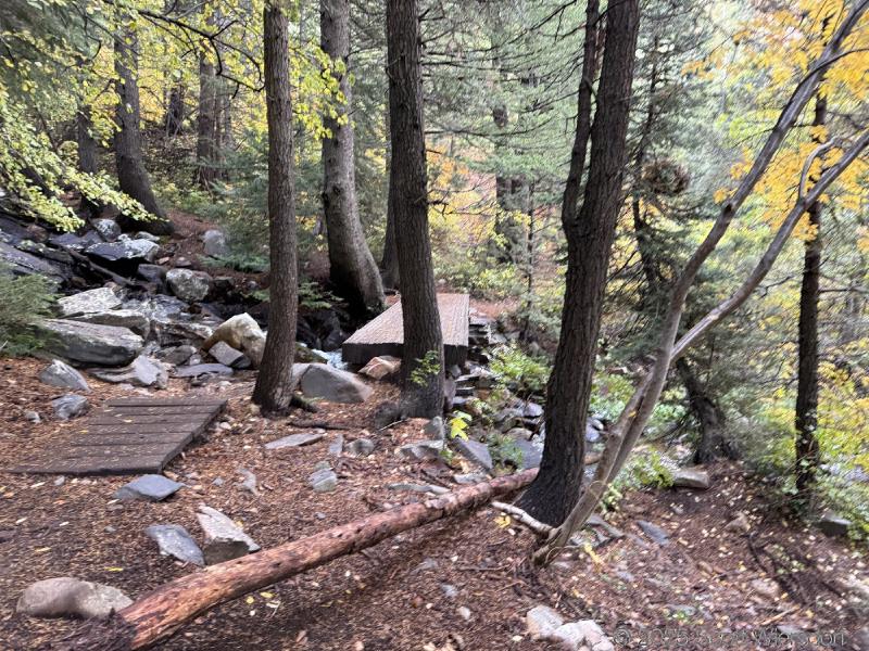 The trailhead is at the base of the “S” curve in Big Cottonwood Canyon. There are two trailheads that the parking lot services: Mill B South and Broads Fork. Broads Fork is at the west end. We had cool weather, probably in the mid-to-high 40’s (°F), with an occasional light breeze. Cloud cover kept us cool most of the way up. If we stopped for more than a few minutes, the breeze chilled us off pretty good. No complaints about the weather—it was a perfect day for us. We noticed a few patches of snow trapped in some of the high elevation (and sheltered) plants from yesterday’s storm that passed through.