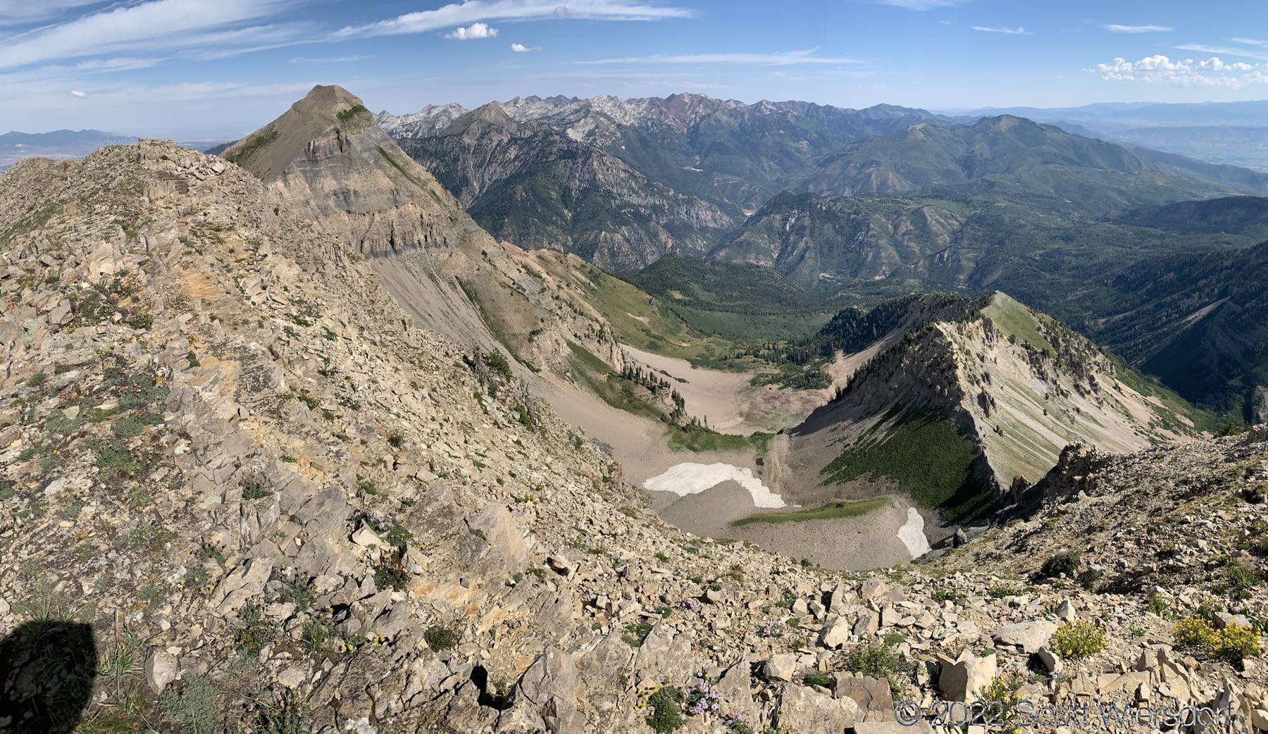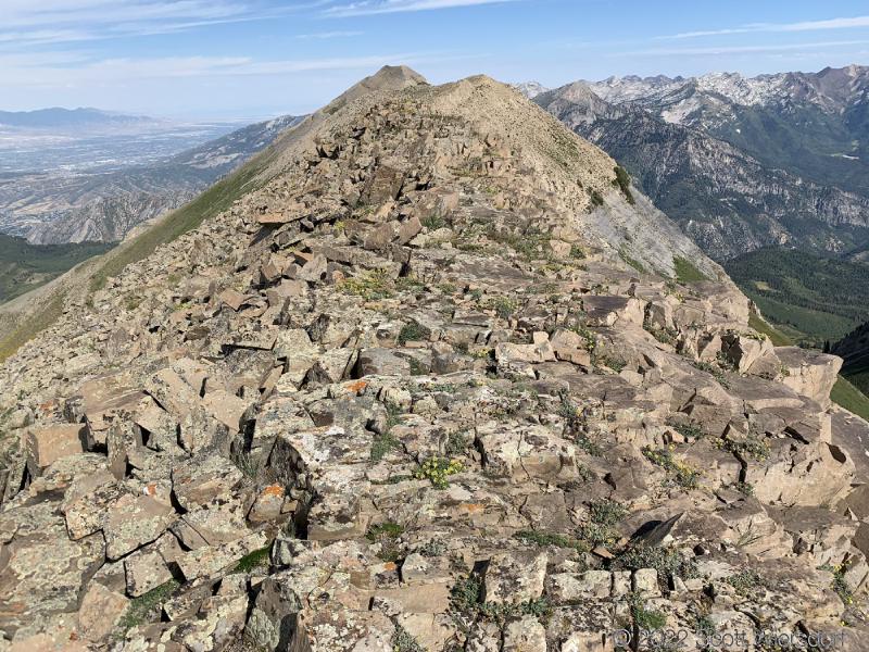 The ridge is unfriendly once you’re past Bomber Peak. No real trail. No dangers either, but it’s not an easy walk. In the final push to the North Timpanogos summit, you lose over 600 feet of elevation which you have to make up again in .3 miles, making most of the final pitch over 45° in some spots.