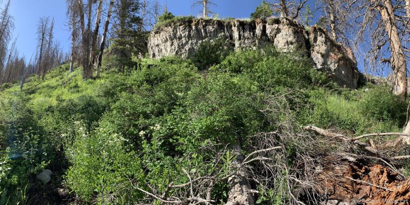 The trailhead is accessed from the Deer Creek-Dry Creek Trail (#043) . There is a post about 0.38 miles from the trailhead that indicates the junction with the Phelps Canyon trail (#046) . The post looked like it was a sign once upon a time, but it appears that trail #046 is no longer maintained by the Forest Service (I could find no mention of it on the Pleasant Grove Ranger District website), possibly since the Phelps Canyon fire in July 2012 . That trail closure will be important to understand later.